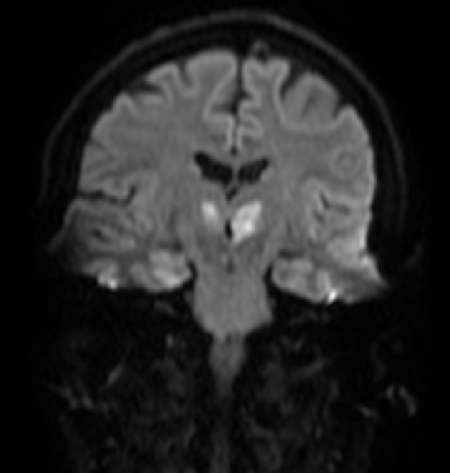 In neurology, the Artery of Percheron is a rare anatomical variant in which the blood supply for both medial thalamic nuclei arises from a single small arteriole at the top of the basilar artery, rather than from two individual arteries. An embolism or occlusion in the Artery of Percheron causes simultaneous bilateral infarcts. The medial thalami are necessary for maintenance of consciousness and attention, therefore artery of percheron stroke can cause an abrupt decrease in level of consciousness, confusion and drowsiness.