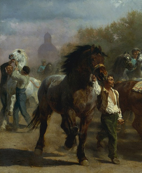 Percherons are intelligent draft horses from western France, as seen in this painting by Rosa Bonheur of a French horse fair in the mid-1800’s. A number of white Percherons are seen on the right side of the painting.