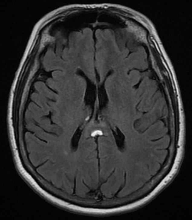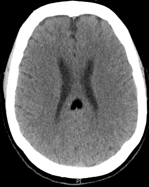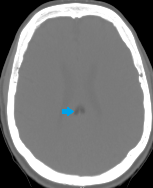 A middle aged woman was seen in the emergency department for confusion, and a non-enhanced head CT was obtained, shown below. Her exam was otherwise normal.