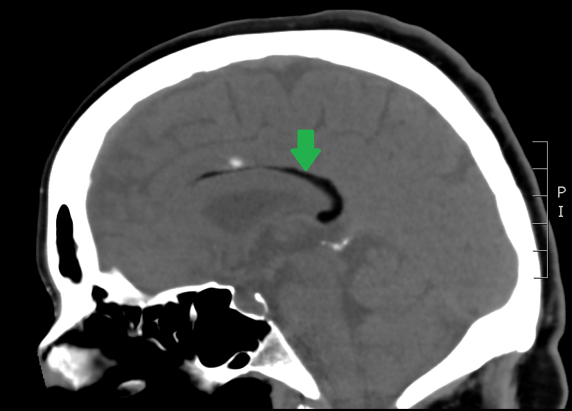 All three images above are non-enhanced head CT’s. First, locate the lesion – it is highlighted by a green arrow in the saggital, and by a blue arrow with bone windowing in the axial imaging. Where is it? What is the density compared to the surrounding brain tissue and CSF? Given the density, what should be in your differential diagnosis?