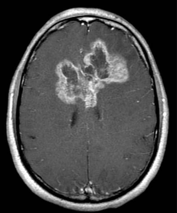 One important ring enhancing lesion on brain MRI is a glioblastoma multiforme, or GBM – an aggressive type of brain tumor. A GBM is a high grade primary brain tumor. It develops from atrocytes, and is therefore called a stage IV astrocytoma.